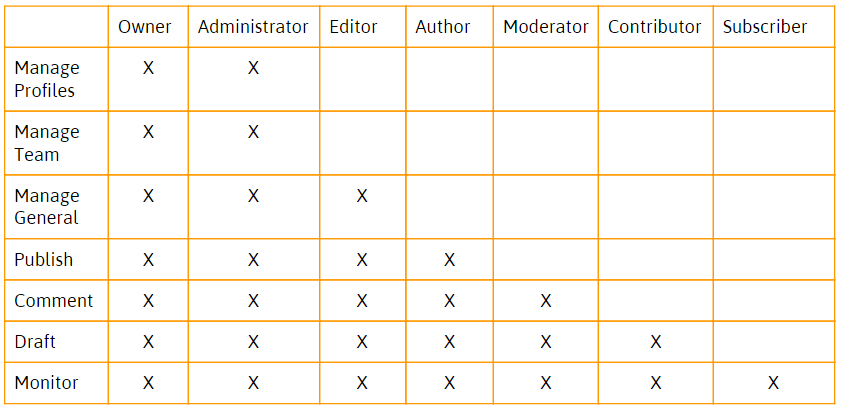 She gets support in the creation of content. This means that she assigns roles to other colleagues and contributors who can draft and publish content, reply to comments and read the latest news through the monitoring features.